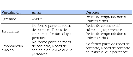 Con relación a las necesidades de los emprendedores, al inicio manifestaron acompañamiento en Finanzas y Contable, investigación de mercado. Mientras que, al finalizar el proyecto, todos enfatizaron en el desarrollo de tecnología. Este cambio de perspectiva tiene relevancia, ya que es una tendencia que en la zona de Itapúa no se visibiliza a partir de la vinculación universidad-empresa. También se deben analizar desde la vinculación, que antes de la intervención era nada frecuente por parte de los egresados y actualmente, a raíz del reconocimiento por parte del grupo de egresados de que el desarrollo de tecnologías en sus empresas necesita apoyo y de que las IES son parte de la solución al problema, se puede decir que el grupo de egresados, después del proyecto, inició su colaboración con la universidad. Pues, el grupo de egresados logró visualizar la posibilidad de apoyo de la universidad, faltaría incentivo a los demás grupos, especialmente los emprendedores externos.