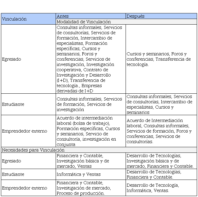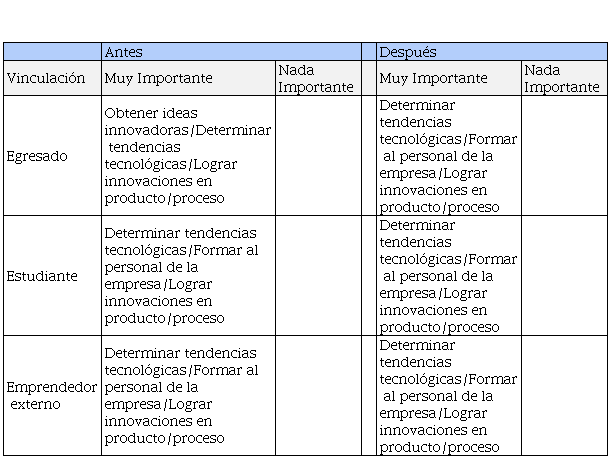 La tercera etapa hace referencia a la aplicación del instrumento pre y post actividades de vinculación para medir los cambios en las gestiones de innovación. Para el análisis de los datos se utilizó la hoja de cálculo Excel, donde se consideró al tipo de vinculación como variables independientes (egresados emprendedores, estudiantes emprendedores, emprendedores externos). Posteriormente y a partir de los objetivos de la investigación, se agruparon las variables para representarlas en tablas dinámicas, esto, considerando la percepción antes y después de las actividades de vinculación.