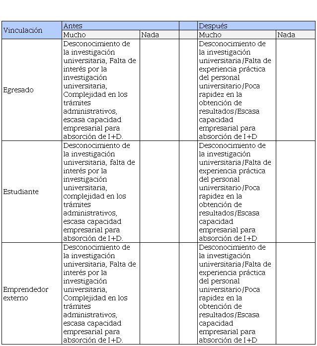 Con relación a los factores que influyen en la vinculación, todos los emprendedores con y sin vinculación han mantenido su percepción antes y durante el proyecto, que el desconocimiento de la investigación universitaria, la falta de interés por parte de las empresas por la investigación, entre otros factores, prevalece en mayor medida para que se pueda dar una relación de confianza entre empresas y universidades. Manifestaron que las MIPYMES tienen escasa capacidad para absorber conocimiento, predomina la cantidad de unidades económicas micro empresarios y trabajadores independientes. Se solicitó, además, la percepción sobre los obstáculos que consideran tener para vincularse con la universidad u otras instituciones, y el mayor grado de obstáculo consideran es el interés de los propios emprendedores para vincularse, dificultad en la comunicación entre las universidades y empresas, no identifican motivación para relacionarse además del poco tiempo que disponen para realizar actividades de manera conjunta.