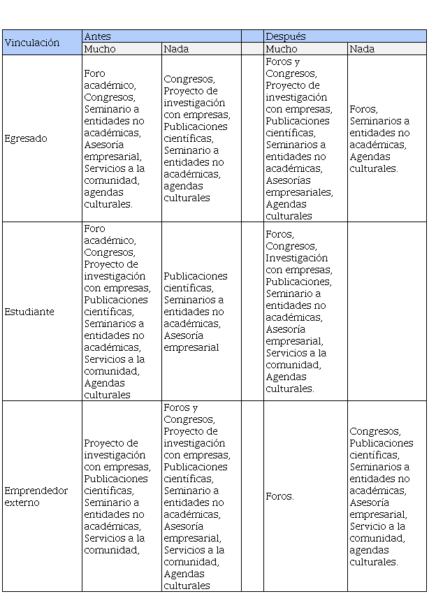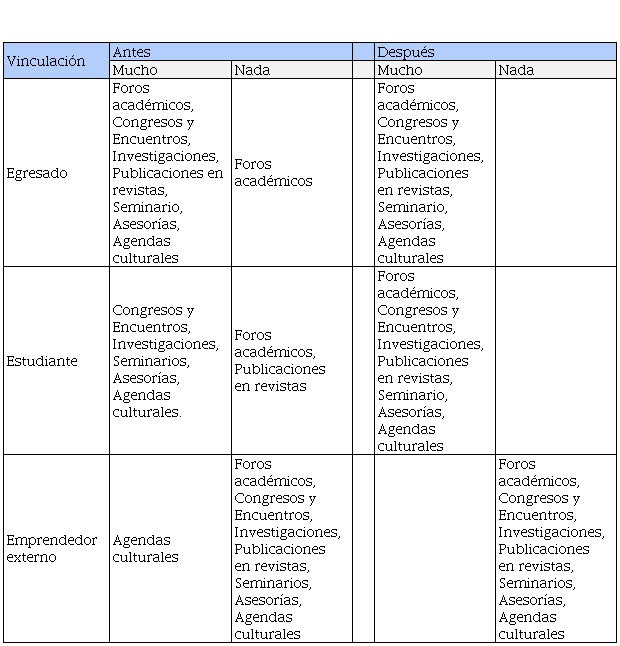 En la tabla 6 se evidencia la necesidad de trabajar con más énfasis con los emprendedores externos, pues no se sienten acompañados por la universidad después de realizar distintas actividades durante el año, lo cual supone escasa relación de la universidad con su entorno externo. Antes de formar parte del proyecto, los egresados (50%) y estudiantes (50%) también tenían bajo nivel de participación en actividades como foros académicos y publicaciones en revistas, y luego del proyecto cambiaron de percepción.