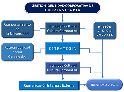 La identidad corporativa se establece como categoría central y vector esencial de la gestión de la imagen y reputación corporativa en las organizaciones. Ella es el fundamento de la imagen y de la reputación corporativa, ya que son conceptos que forman parte de un todo y poseen una interacción dialéctica y sistémica; y en lo que respecta al ámbito universitario, podemos afirmar que su gestión contribuye al desarrollo de la marca universitaria Suvatjis, de Chernatony y Holikias (2012) establecen etapas en el desarrollo de la identidad; en la primera, se define la filosofía corporativa (misión, visión, valores universitarios); posteriormente, se definen la cartera de productos y servicios, el sistema de identidad visual y sobre todo las comunicaciones de la identidad.