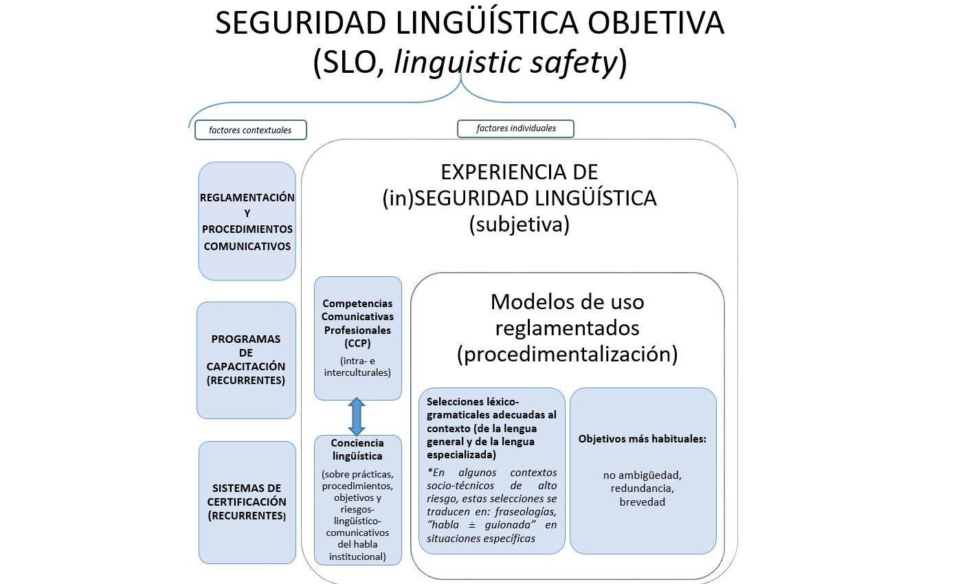 En contextos socio-técnicos (Nevile, 2004) y de alto riesgo (Dietrich y von Meltzer, 2003), por otro lado, la interacción verbal entre distintos profesionales resulta clave para alcanzar los objetivos organizacionales y para propender a la seguridad de las personas que intervienen en la interacción, la de las instalaciones e infraestructura, así como también la de otras personas no involucradas de manera directa en los procesos comunicativos. En estos contextos, es posible y necesario considerar una categoría adicional que atienda a describir tanto la SLO de los enunciados (cfr. Philps, 1992) como, por extensión, la de los propios contextos profesionales, esto es, una categoría que permita evaluar producciones verbales y ámbitos laborales como lingüística y comunicativamente seguros (Mitchell, 2016; de- Matteis, 2010 y 2020).