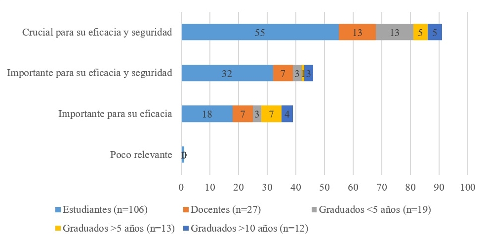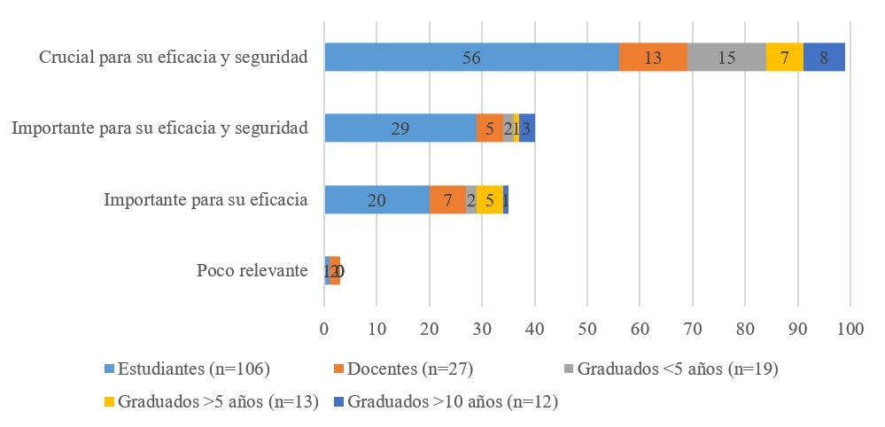 (13) No sólo es importante sino determinante, por eso mi respuesta de ser “crucial”. Determinará el curso y desenlace de parte o gran parte del proceso de salud-enfermedad de muchas personas, por la calidad y seguridad de la atención que se pueda otorgar como equipo profesional o decisior en conjunto. (F, 18-25 años, Medicina, 4º año, IV)
