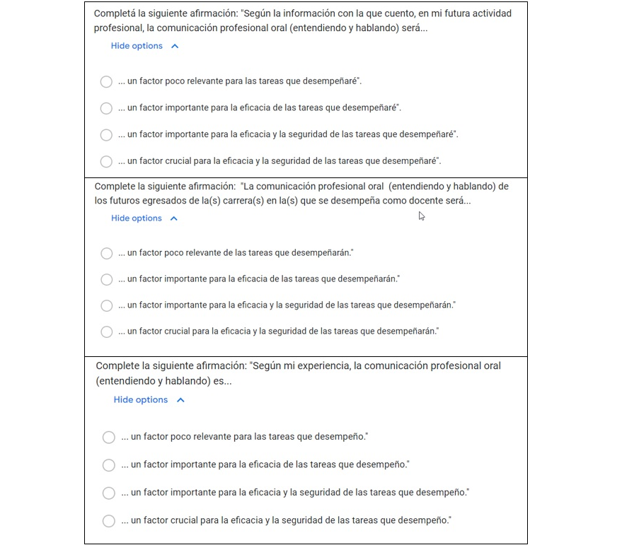 Desde el año 2020 se implementó un cuestionario en línea que, entre diversos aspectos vinculados con el desarrollo de las CCP en el nivel universitario de grado, consideró las percepciones de los estudiantes, docentes y graduados de la UNS frente a la importancia que sus interacciones verbales tienen o tendrán en sus actividades laborales. Específicamente, se intentó con estas preguntas elicitar las estimaciones de los estudiantes y las evaluaciones de los docentes y egresados, ya insertos en el mundo laboral, con respecto a la importancia de la interacción oral y escrita para la eficacia y seguridad de las tareas profesionales, así como la justificación de tales estimaciones y evaluaciones.
