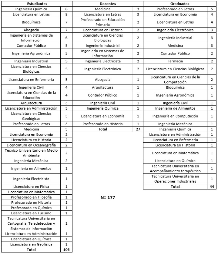 En este trabajo se analizan 177 respuestas:12 la mayoría de ellas (106) corresponde a estudiantes de grado, 27 a docentes y otras 44 a egresados. Como puede verse en la tabla 1, la muestra está desequilibrada en relación con las carreras con las que se vinculan los hablantes, y de muchas de ellas se obtuvo una única respuesta, por lo que no pueden establecerse todavía correlaciones entre el nivel de importancia asignado a las prácticas comunicativas y el tipo de formación y futuras tareas profesionales. Tampoco se encuentran equilibradas las áreas disciplinares a las que pertenecen las carreras. No obstante ello, en el análisis cualitativo de las respuestas a preguntas abiertas se hará referencia a la trayectoria universitaria para situarlas en su contexto específico.