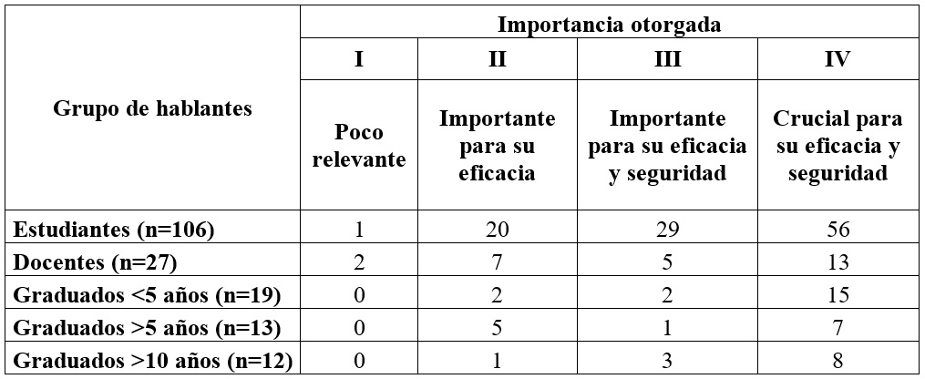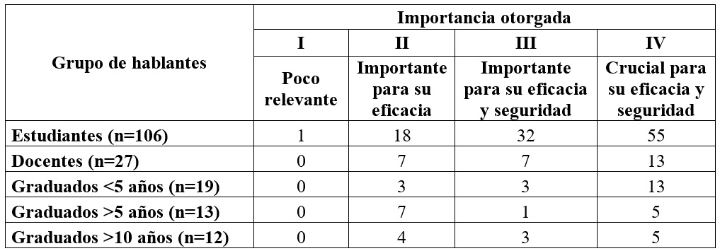 En todos los grupos de hablantes predomina la consideración de que la comunicación profesional oral es crucial o importante para la eficacia y seguridad de las tareas a desempeñar en el ámbito laboral (tabla 2), y la máxima valoración (nivel IV) supera siempre a la segunda (nivel III).