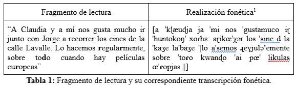 En el audio la estudiante lee un fragmento de texto. En la tabla 1 se visualiza el fragmento de lectura y su correspondiente realización fonética por parte de la hablante. Resaltamos en negrita aquellas palabras que son objeto de nuestro análisis.