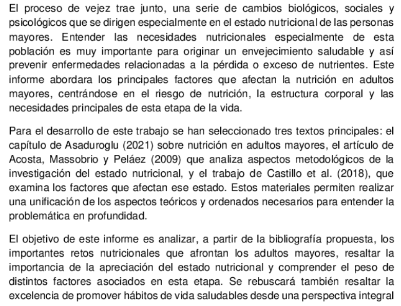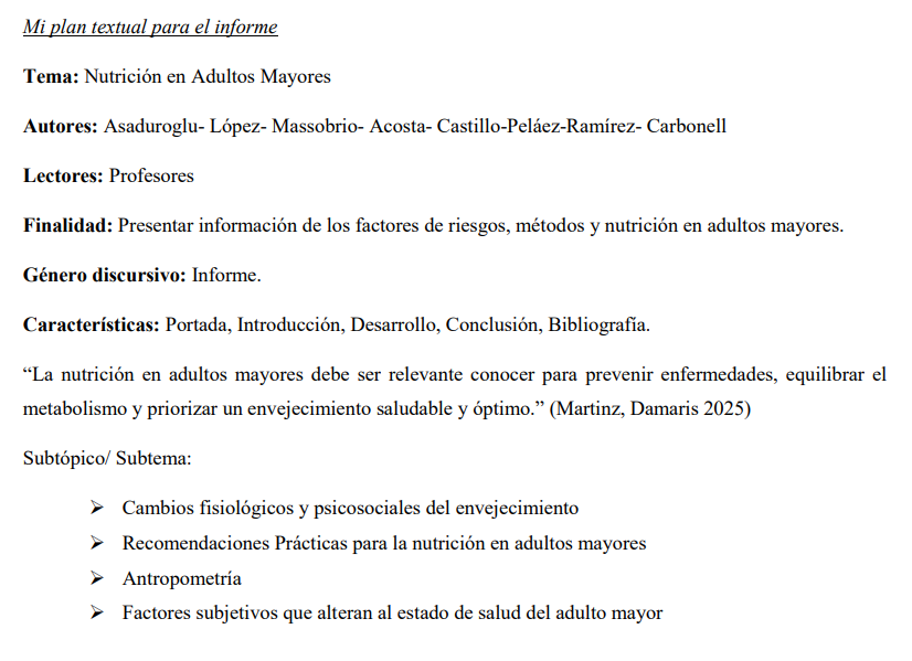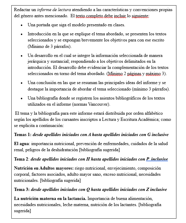 La instancia de primera evaluación parcial (escrita y domiciliaria) se desarrolló en la última semana de abril y la primera de mayo. Hemos buscado traer a primer plano la dimensión procesual de la escritura, es decir, en etapas (Cassany, 1989), así como su enriquecimiento en la medida en que, en distintas clases, seguíamos abordando nuevas competencias discursivas. El género informe de lectura se solicitó en base a algunos de los temas de nutrición previamente seleccionados (importancia del agua en la nutrición, la nutrición de adultos mayores y la nutrición durante la lactancia materna), los cuales fueron distribuidos alfabéticamente, según los apellidos de las y los estudiantes. En este sentido, en distintas semanas hemos solicitado, por ejemplo, los planes de texto, distintos borradores, versiones mejoradas luego de una coevaluación entre pares. A continuación traemos la consigna propuesta en ese período: