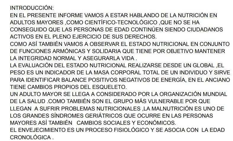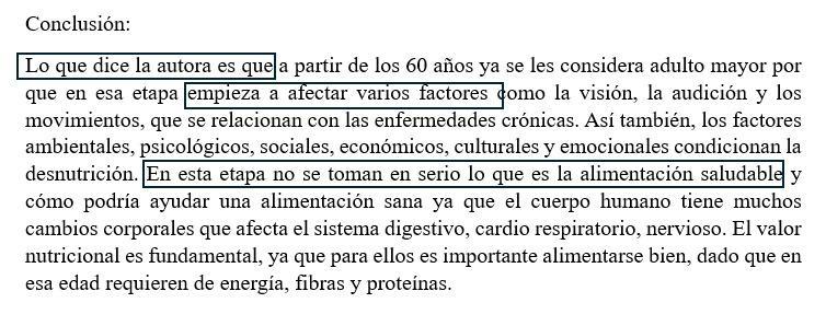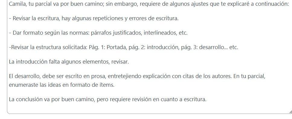 Estos puntos problemáticos, a la vez, se configuran en retroalimentación para nuevos andamios de aprendizaje futuros, tanto para el mismo curso como para los subsiguientes. El siguente ejemplo, permite observar con mas detalles la presencia de la oralidad en la escritura del informe: