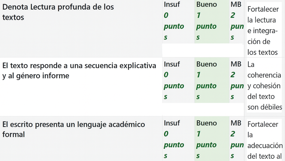 Por otra parte, las consignas han permitido reconocer aspectos formales esperados por los docentes destinatarios –lectores de estos informes de lectura–. En este orden, las consignas han sido socializadas con mucha antelación a la fecha de entrega del examen parcial y esta llevaba anexada una rúbrica de evaluación (Andrade, 2010). Así, nuestra intención era dar a conocer previamente los criterios de evaluación y la rúbrica para que estos dispositivos operen como mediadores en la interpretación tanto de las operaciones de los estudiantes como de las posteriores devoluciones de los docentes. Al mismo tiempo, estos dispositivos permitieron delinear y transparentar nuestra labor docente en torno a competencias específicas (criterios) a ser reconocidas en los informes de lectura recibidos. Asimismo, es importante destacar que la configuración de la rúbrica como estrategia de devoluciones puntualizadas y de calificación ha resultado de suma practicidad para el equipo docente.