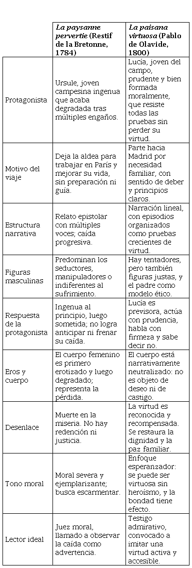 El núcleo común entre ambas novelas, una joven campesina expuesta al mundo urbano, puesta a prueba por la codicia o el deseo, y obligada a enfrentar el conflicto entre virtud y tentación, no debe ocultar que su desarrollo responde a lógicas radicalmente distintas. La novela francesa, como se ha visto, se construye sobre una pedagogía del escarmiento, en la que el lector asiste al proceso de degradación física y moral de una joven cuya caída es representada como inevitable. La narración no ofrece redención ni consuelo: propone una lección ejemplar negativa que disuade mediante el miedo y que utiliza el cuerpo de la protagonista como superficie de inscripción del castigo. El lector observa, juzga y teme.