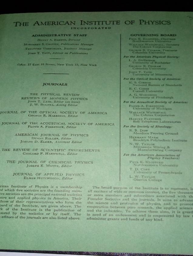 Portada y Directorio de The Physical Review,de agosto 1 y 15 de 1945.
