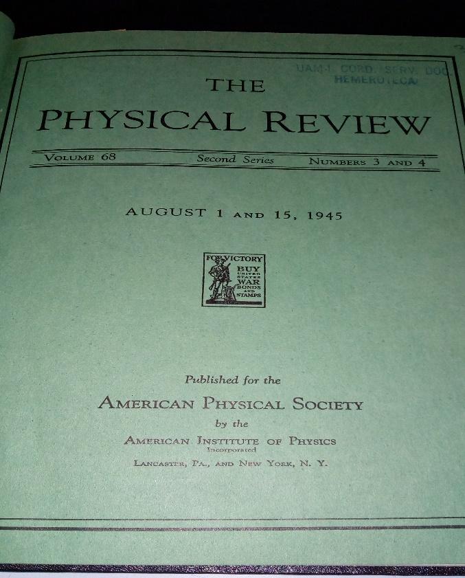 The Physical Review, Second Series, vol. 59, núm. 1-12, 1941. The Physical Review, Second Series, vol. 60, núm. 1-12, 1941. The Physical Review, Second Series, vol. 61, núm. 1-12, 1942 The Physical Review, Second Series, vol. 62, núm. 1-12, 1942. The Physical Review, Second Series, vol. 63, núm. 1-12, 1943. The Physical Review, Second Series, vol. 64, núm. 1-12, 1943. The Physical Review, Second Series, vol. 65, núm. 1-12, 1944. The Physical Review, Second Series, vol. 66, núm. 1-12, 1944. The Physical Review, Second Series, vol. 67, núm. 1- 12, 1945.