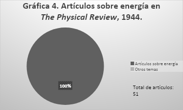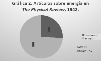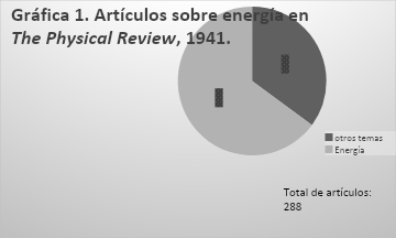 En 1941, The Physical Review divulgó 288 artículos en sus publicaciones quincenales, de ese número total de artículos anuales, 187 (35%) fueron dedicados a la energía de alta densidad o relacionada con el paradigma de la termodinámica (véase gráfica 1). Para 1941 aún es posible encontrar temas que no se centran exclusivamente en la obtención de energía. Los temas distintos al de energía eran conductividad, magnetismo, inelasticidad, vibraciones polares, gases ideales, presión de torque en automóviles, metodología de la física, organización de la tabla periódica y deformaciones de materiales.16