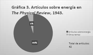 Elaboración propia con datos de The Physical Review, Second Series, Vol. 61, núm. 1, 2, 3, 4, 5, 6, 7, 8, 9, 10, 11, 12, 1942; The Physical Review, Second Series, Vol. 62, núm. 1, 2, 3, 4, 5, 6, 7, 8, 9, 10, 11, 12, 1942..En 1943 la revista presentó una disminución aún más drástica que la que ocurrió el año previo. Para este momento había 2 (5%) artículos sobre temas ajenos a la energía y 40 (95%) sobre energía, éstos dan como total 42. El descenso en el número de artículos era una cuestión meramente académica, sin embargo, es posible entenderlo desde la relación ciencia, academia, industria y Estado. Para los Estados Unidos, el obtener recursos se convirtió en un tema primordial, de ahí que se observe la importancia de los bonos de guerra que The Physical Review anunciaba desde 1942 y permanecieron en 1943, principalmente en los números de la revista 1 y 2 que salieron como una publicación doble.26