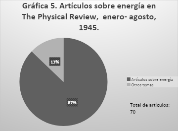 Las siguientes líneas tienen como objetivo presentar un caso específico: la publicación de artículos relacionados con la energía en la revista The Physical Review entre 1941 y 1945. Los artículos en esta revista de física fueron decreciendo de manera constante en cuanto al número de textos publicados al mismo tiempo que la temática de la energía se consolidaba como eje principal. Esta circunstancia indica que el flujo de información y publicaciones se mantuvo a pesar de los avatares del conflicto bélico que significó la Segunda Guerra Mundial. Por esta razón es viable afirmar que la circulación de información apoyada en el internacionalismo científico no fue afectada de forma abrupta por las condiciones de la guerra.
