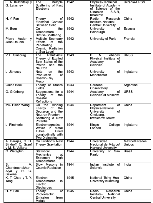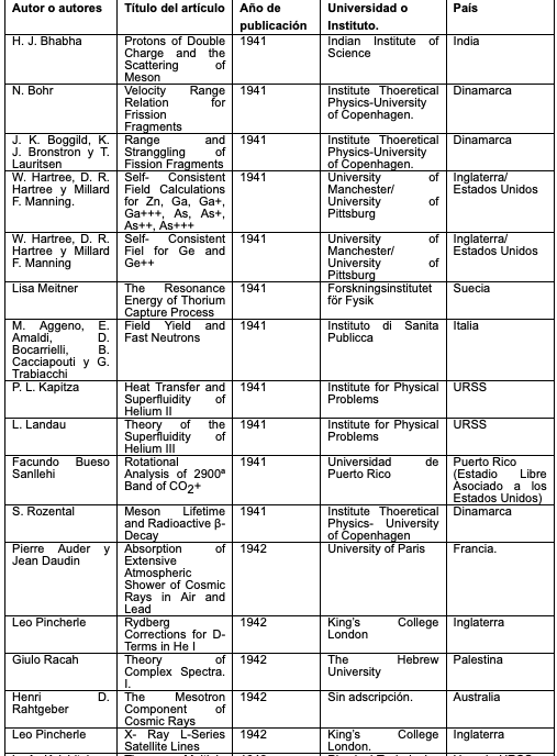 Elaboración propia con datos de The Physical Review, Second Series, Vol. 67, 1, 2, 3, 4, 5, 6, 7, 8, 9, 10, 11, 12, 1, 2, 3, 4, 1945.Los autores y su origen