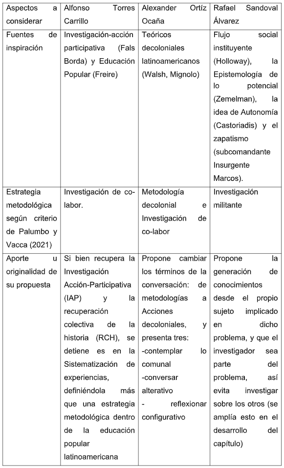 Si bien estos autores no están en diálogo entre sí, y solo Sandoval Álvarez se detiene en explicitar quién es ese sujeto que piensa la realidad y construye conocimiento, algo que en los otros dos autores aparece como movimientos sociales, comunidades, organizaciones políticas, los tres asumen una perspectiva crítica y comprometida, y fusionan la teoría con la práctica. A esa inserción y centralidad del sujeto la resuelven de diferente manera. Se valen de diferentes estrategias y fuentes de inspiración. Sin ánimo de sintetizar las propuestas, solo para una lectura más ágil, se detallan algunos aspectos en el cuadro a continuación: