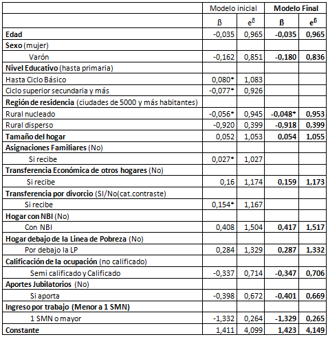 El segundo paso en la construcción de este modelo es el ajuste con todas las variables señaladas anteriormente, de forma de confirmar que todas deben permanecer en el modelo o, por el contrario, descartar aquellas variables que no resultaron con significación estadística, lo que implica que su variación no impacta en la probabilidad o chances de ocurrencia del fenómeno bajo estudio; en definitiva, que no aporta a su explicación. Esta situación se dio con tres de las variables incorporadas: nivel educativo del asalariado, asignaciones familiares en el hogar y transferencias económicas privadas por divorcio en el hogar.