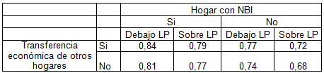 En el segundo caso se busca visualizar un perfil de hogares determinando el impacto de las características de estos en la transitoriedad de los empleos agrarios. Se incluyeron tres variables: NBI, línea de pobreza y transferencias económicas de otros hogares. En la siguiente Tabla 2 se observan los resultados.