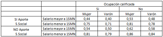 Finalmente, se buscó establecer un perfil de riegos observando el efecto de las variables referidas a empleo y distinguiendo entre varones y mujeres. El peor pronóstico se estima para una mujer que no aporta a la seguridad social, con un salario menor a 1 Salario Mínimo Nacional y con una ocupación no calificada, donde la probabilidad de transitoriedad en el empleo alcanza al 86 %, en tanto en el otro extremo se encuentra un varón con aportes sociales, ingreso mayor a 1 Salario Mínimo y ocupación calificada, donde la probabilidad es del 40 %12.