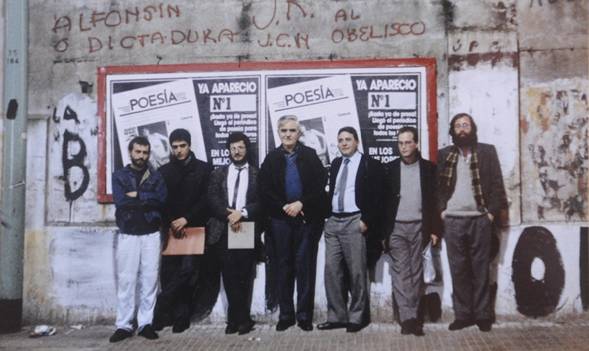 La poesía como un mundo con sus propias reglas y una temporalidad propia, una constante en Diario de poesía desde el comienzo, en un contexto argentino que suele ejercer presión en otras direcciones. Una fotografía de 1986 muestra a integrantes del grupo responsable inicial posando frente a un gran afiche publicitario. El anuncio del primer número de la revista se sobreimprime sobre un muro con escrituras previas, en graffiti, –“Alfonsín o dictadura”, “Todos al obelisco”– interpelando a los lectores urbanos.