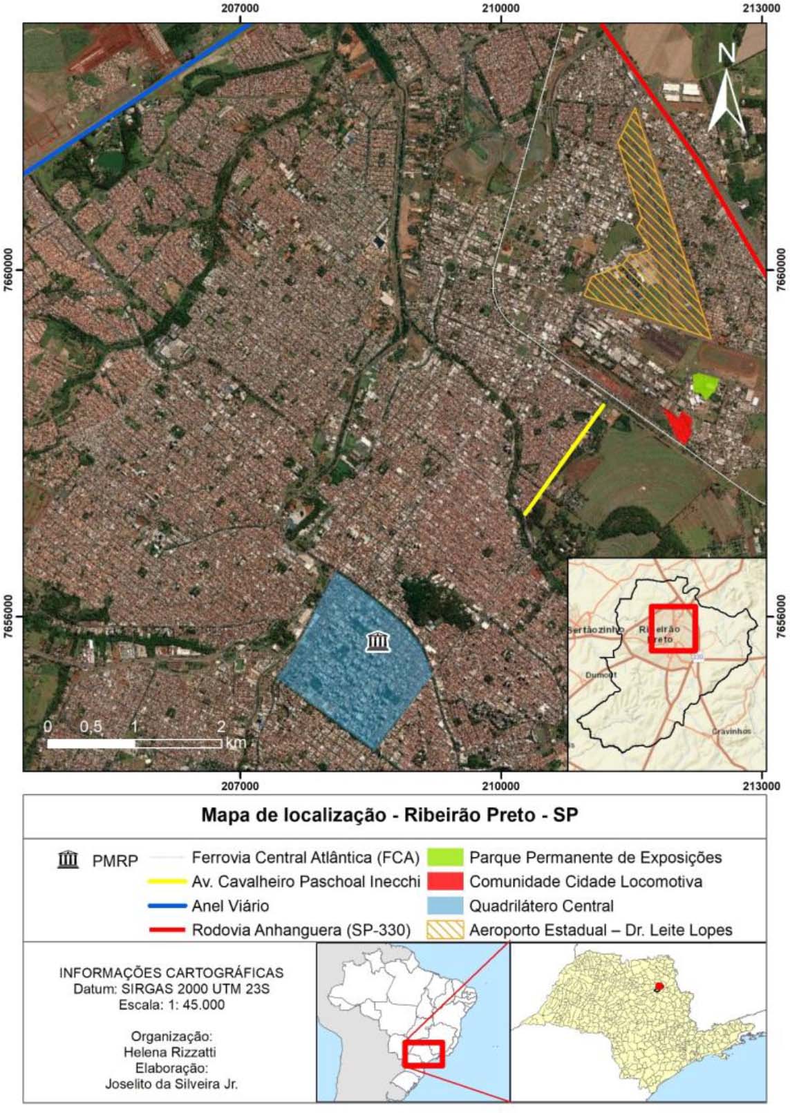A Cidade Locomotiva localiza-se, hoje, nos arredores do Aeroporto Estadual Leite Lopes, no extremo norte da cidade de Ribeirão Preto6, às margens da Ferrovia CentroAtlântica (FCA). Constituiu-se, nesse local, desde fevereiro de 2014, após ser removida do bairro Ribeirão Verde, próximo à área atual (Imagem 1). Hoje, vivem ali 370 famílias (ao redor de mil pessoas). Seu nome se deve ao fato de que, no terreno vazio, interno ao perímetro urbano, onde se instalou a ocupação, havia centenas de vagões de trem abandonados. Parte deles foi transformada em entulhos para o aterro da área e a outra parte, ao redor de dez vagões, foi transformada em moradia.