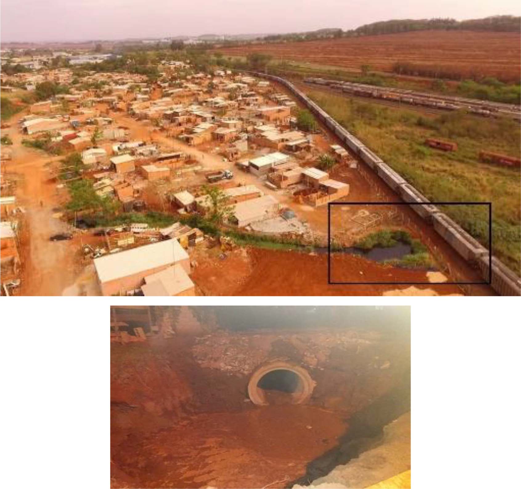 Outra especificidade do terreno deve-se à destinação da área como bacia de contenção de águas pluviais9, com seu ponto mais baixo cumprindo a função de escoar o excesso de água superficial: um canal pluvial. A comunidade está toda rodeada por indústrias, que despejam seus esgotos sem tratamento nesse sulco profundo do terreno; além disso, alguns domicílios da ocupação e de favelas ao seu redor não possuem fossas sépticas. Logo, o canal pluvial torna-se um esgoto a céu aberto e, para escoar, necessita atravessar por baixo da linha férrea.