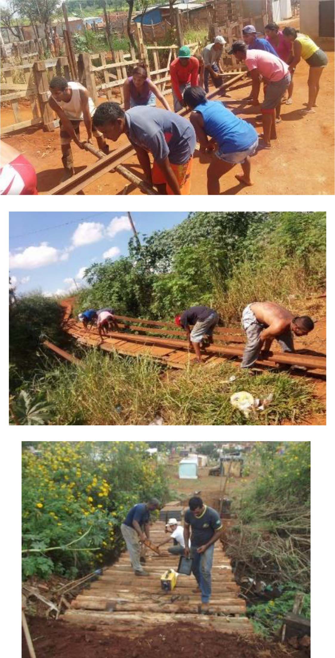 A instalação dessas infraestruturas coletivas, ou seja, que não são feitas para cada casa, exige trabalho coletivo. Na Imagem 8, está registrado um desses momentos para a construção de uma ponte com o uso dos trilhos de trem como base que, depois, foi finalizada com madeira.