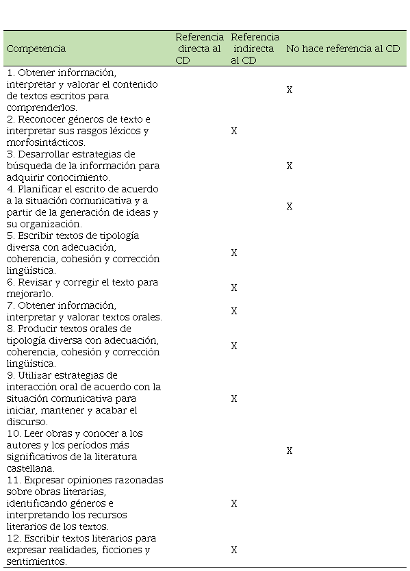 Tal y como se ha comentado, el Decret 187/2015 y el Decret 142/2008 prevén cuándo debe trabajarse el CD. Si bien es cierto que en Bachillerato se hace de una forma más laxa, en ESO se indica explícitamente. Por esta razón, únicamente se prestará atención a las indicaciones del Decret 187/2015, para ver si esa secuenciación antes mencionada se refleja en el trabajo competencial. Más concretamente, se observa qué competencias hacen referencia al CD, distinguiendo si se refieren a él de manera explícita o implícita, y qué competencias no hacen referencia al CD (Tabla 1).