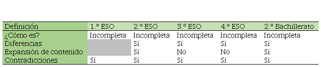 Una vez vista la secuenciación, se procede al análisis del contenido. Al tratarse de los libros de texto de toda la educación secundaria, se propone una tabla de datos para cada variable en la que se reflejen las diferencias y las similitudes de cada uno de ellos. En primer lugar, se muestran los resultados de la Tabla 2, correspondiente a la definición: