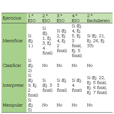 En quinto lugar, se estudia la tipología de ejercicios que ofrecen los manuales seleccionados. Se ha partido de las variables que propone Zayas (2011) en su tipología de actividades gramaticales. No obstante, se ha hecho alguna adaptación, puesto que dichas variables no recogen el parámetro de la identificación. Teniendo esto en cuenta, se ha analizado si son actividades de: