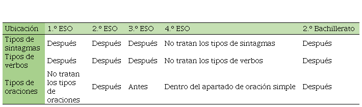 En quinto lugar, se ha observado la ubicación dentro del organigrama de contenidos gramaticales. Los resultados se muestran en la Tabla 6: