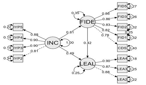 Finalmente, las correlaciones moderadas entre los constructos de lealtad, fidelización e incentivos (0.55 a 0.71) muestran que estas dimensiones están interconectadas. Por ejemplo, los incentivos y la comunicación del proveedor (IYP) tienen un impacto en la fidelización (FID), que a su vez refuerza la lealtad (LEA). Estas relaciones subrayan que, aunque cada constructo mide aspectos específicos, juntos contribuyen a una experiencia integral del cliente.