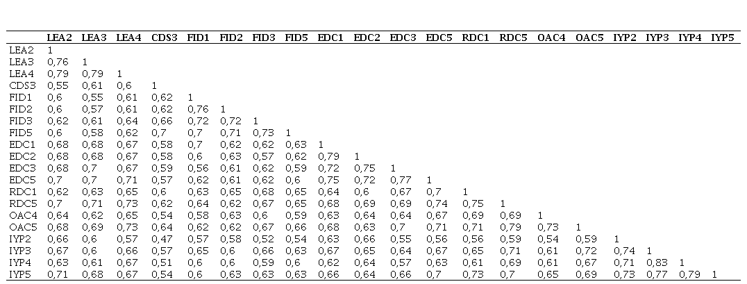 Como se ve en la Tabla 1, los indicadores de lealtad (LEA2, LEA3, LEA4) muestran correlaciones altas entre ellos, con valores que oscilan entre 0.76 y 0.79. Esto indica que los clientes que están dispuestos a contratar servicios adicionales con su proveedor actual (LEA2) también tienen intención de continuar utilizando el servicio como su principal opción (LEA3) y prefieren mantenerse con su proveedor actual, incluso si existen alternativas similares en el mercado (LEA4). Estas relaciones refuerzan la coherencia en la medición del constructo de lealtad.