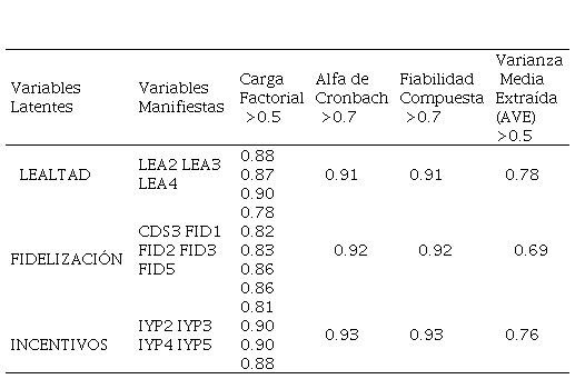 La Tabla 2 establece que el Alfa de Cronbach de los tres constructos superó el umbral aceptable de 0.7, con valores de 0.91 para LEALTAD, 0.92 para FIDELIZACION y 0.93 para INCENTIVOS. Estos resultados confirman que las variables manifiestas asociadas a cada constructo presentan una consistencia interna adecuada (Hair et al., 2019). Además, la Fiabilidad Compuesta (CR), que evalúa la estabilidad y precisión de las mediciones, alcanzó valores de 0.91, 0.92 y 0.93 respectivamente, superando el umbral recomendado de 0.7.