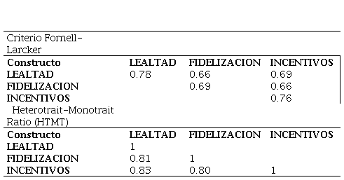 La tabla 3, refleja que el análisis de fiabilidad y validez convergente de los constructos LEALTAD, FIDELIZACIÓN e INCENTIVOS se llevó a cabo utilizando las cargas factoriales, el Alfa de Cronbach, la Fiabilidad Compuesta (CR) y la Varianza Media Extraída (AVE). Los resultados indican que los constructos cumplen con los criterios establecidos para considerar que los indicadores miden de manera consistente y válida las dimensiones propuestas.