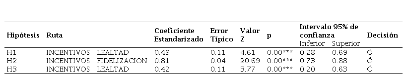 En primer lugar, la Tabla 4 establece una relación positiva y significativa entre INCENTIVOS y LEALTAD (β = 0.49, Z = 4.61, p < 0.001). Este coeficiente estandarizado indica que los incentivos tienen un efecto fuerte en la lealtad. El intervalo de confianza al 95% [0.28, 0.69] no incluye el valor cero, lo que confirma la significancia estadística de esta relación. Además, el error típico asociado (SE = 0.11) es bajo, sugiriendo que la estimación es precisa y estable.