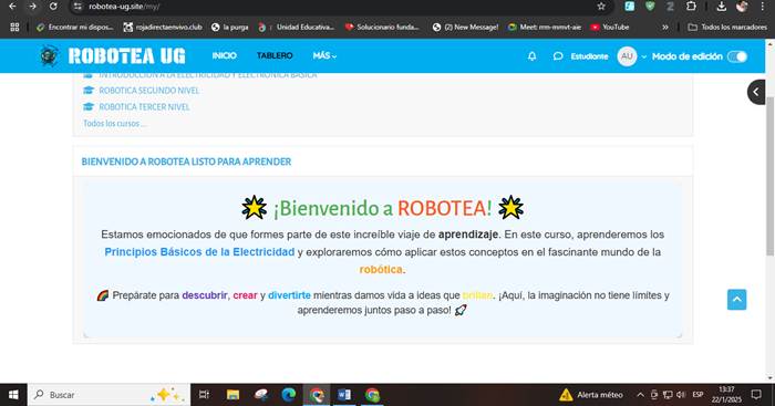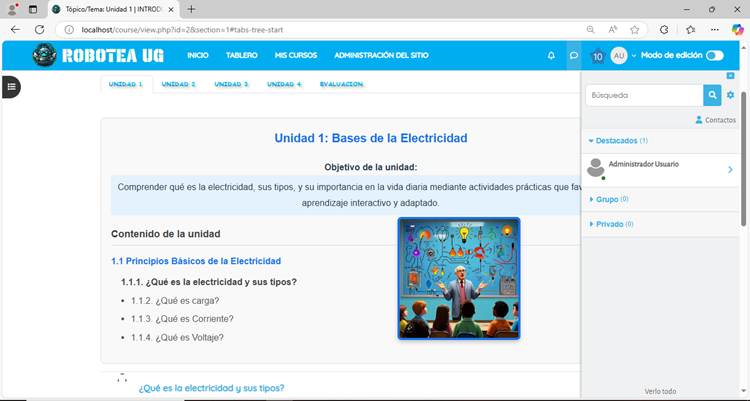 Antes de mostrar los resultados, es importante describir con detalle el entorno Moodle utilizado en el estudio. Este entorno está disponible en línea a través del siguiente enlace: https://robotea-ug.site/. A continuación, se presentan las principales pantallas que forman la estructura del curso y explican su funcionamiento.