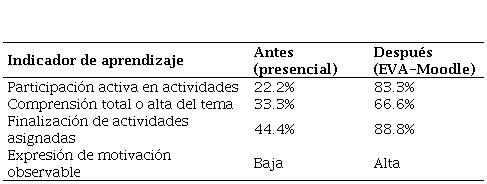 Se analizaron los registros de uso de los 9 participantes que accedieron al EVA, tomando en cuenta indicadores como participación, comprensión, cumplimiento de tareas y motivación observable, comparándolos con los datos recogidos durante las sesiones presenciales. Aunque no se realizó una comparación estricta “antes y después”, los resultados indican una mejora significativa en la experiencia de aprendizaje tras incorporar el recurso digital, tal como se muestra en la Tabla 1.
