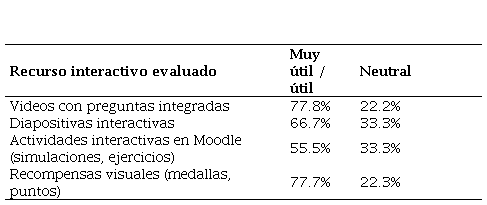 Además, aunque las actividades interactivas (simulaciones y ejercicios) fueron consideradas útiles por el 55.5% de los participantes, este dato señala que todavía hay espacio para mejorar aspectos como la claridad de las instrucciones y la adecuación de acurdo al nivel de complejidad.