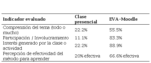 La Tabla 3 compara indicadores clave de motivación e implicación entre la modalidad presencial y el uso del EVA en Moodle. Se observa un aumento significativo en la comprensión del tema, que pasa de 22.2% en presencial a 55.5% en el entorno virtual, confirmando la efectividad de los materiales visuales e interactivos diseñados especialmente para esta población.