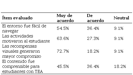 No obstante, cabe destacar que el 18.2 % de los docentes y familiares mantuvo una posición neutral respecto a la comprensibilidad del contenido, lo que señala áreas susceptibles de mejora, particularmente en la claridad de las instrucciones y en el diseño de actividades interactivas. Este matiz subraya la necesidad de acompañar la implementación del EVA con formación docente continua y ajustes iterativos para atender la diversidad dentro del espectro autista.