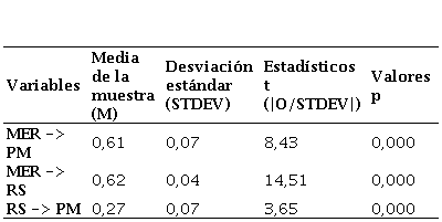 Los resultados obtenidos en los coeficientes de los caminos y los valores de significancia estadística del modelo testeado se presentan a continuación. Las cargas estandarizadas de los ítems sobre sus constructos respectivos pueden observarse en la Figura 2.- Relación estructural del Modelo se pueden establecer de la siguiente manera. La relación entre MER y PM tiene un coeficiente de camino de 0.61, una media de la muestra de 0.62 con una desviación estándar de 0.07, estadísticos t de 8.43 y valores p de 0.000.