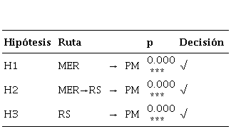 La Tabla 1 detalla, los hallazgos de los constructos empleados mostraron alta fiabilidad y validez. El Alfa de Cronbach alcanzó valores de 0.89 para MER y 0.89 para PM, mientras que los valores de fiabilidad compuesta superaron 0.90, lo que indica una consistencia interna elevada. Este nivel de fiabilidad se complementa con un AVE de 0.65 para MER y 0.66 para PM, valores que superan el umbral de 0.5 y confirman la adecuada variación explicada. La validez discriminante también fue demostrada mediante coeficientes de correlación robustos: 0.87 entre MER y PM, 0.65 entre MER y RS, y 0.68 entre PM y RS.