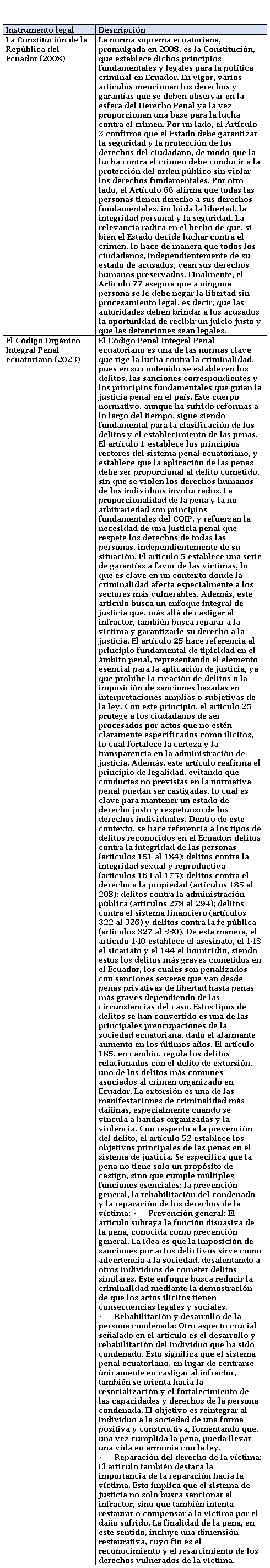 Asimismo, a nivel nacional se analizan las principales normativas que componen el marco legislativo ecuatoriano en su lucha contra la criminalidad, con énfasis en los artículos relevantes que abordan el tema dentro del Derecho Penal (Tabla 2).