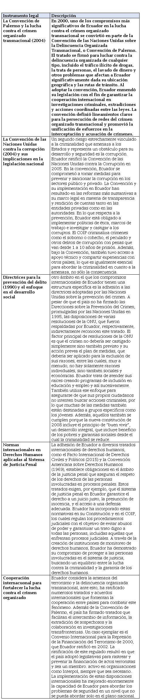Para comenzar, es necesario mencionar los instrumentos internacionales los cuales Ecuador ha ratificado para enfrentar la criminalidad, reducir la violencia y promover la prevención del delito, comprometiéndose a alinear su legislación con los estándares internacionales en esta área. Al adherirse a estos tratados, el país busca mejorar su sistema de justicia penal y fortalecer su respuesta frente a desafíos criminales, especialmente aquellos de naturaleza transnacional. A continuación, en la tabla 1 se analizan los principales convenios y marcos normativos internacionales, destacando su impacto en la legislación y las políticas nacionales.