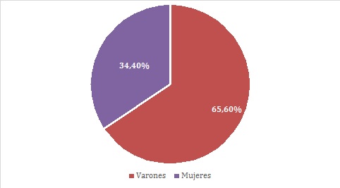La PEA16de ambos barrios registra un 95% de ocupación, existiendo un bajo porcentaje de trabajadores y trabajadoras sin empleo. Este dato da cuenta también de la proliferación de estrategias laborales que se dan en los habitantes de estos barrios para garantizar un ingreso básico para su subsistencia. En el Gráfico 1 se puede observar su composición según género, allí encontramos que el 65,6% son varones y el 34,4% son mujeres. Esta diferencia notable en la participación es significativa, superando incluso los datos que se observan en la PEA del Conurbano bonaerense: 70,5% y 48,3% respectivamente registrados en el mismo periodo por la Encuesta Permanente de Hogares.17