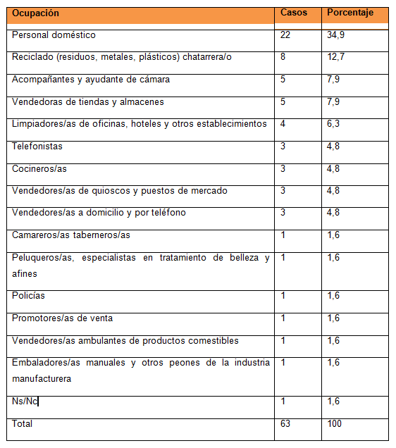 El tipo de ocupación que se registra en los casos relevados muestra claramente el peso de la división sexual del trabajo remunerado en la imbricación de las estrategias de reproducción vinculadas al mundo laboral. Si observamos la Tabla 1 encontramos dos ocupaciones que aparecen como principales canales de absorción de la fuerza de trabajo feminizada en los barrios en estudio: el empleo doméstico remunerado y actividades laborales vinculadas al recupero y reciclado de residuos, metales, plásticos, etc., mientras que en tercer lugar se registran ocupaciones en comercio y venta.18