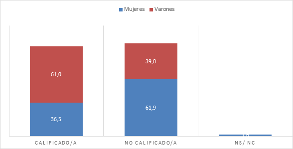 En el Gráfico 2 los resultados señalan que solo el 36,3% de las trabajadoras posee algún tipo de calificación,19 mientras que el 61,9% no poseen ninguna. En el caso de los varones se registra una proporción contraria: el 61% de los trabajadores tiene calificación frente al 39% que no posee. Como se puede observar, es notable la diferenciación según el género en este aspecto. Lo cierto es que a través de las distintas entrevistas realizadas a las trabajadoras acerca de sus trayectorias laborales se evidenciaron los distintos obstáculos institucionales y del orden familiar que obstaculizaron sus posibilidades de formación y/o acceso a oficios por fuera de las ofertas tradicionales (costura, limpieza, cuidado). Sumado a esto, su inserción mayoritaria en actividades vinculadas al trabajo doméstico supone la puesta en práctica de saberes “innatos” de las mujeres que no requerirían mayores calificaciones que las adquiridas a lo largo de su crianza. Las propias taxonomías con las que se miden estas ocupaciones incurren en señalar que se trata de empleos que no requieren mayor tecnificación ni “capacidades de juicio”.